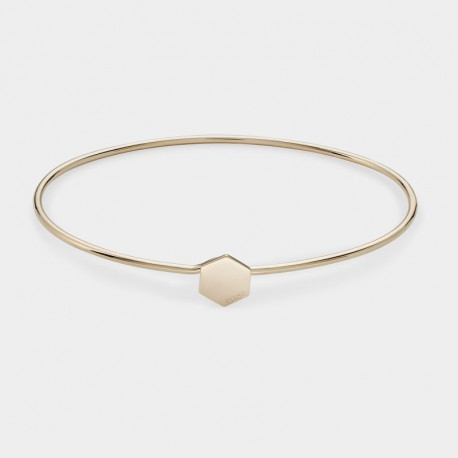 Pulsera rígida fina en oro con bordes redondeados y detalle hexagonal encima del cierre tipo gancho. Grabado sutil con el logotipo CLUSE.